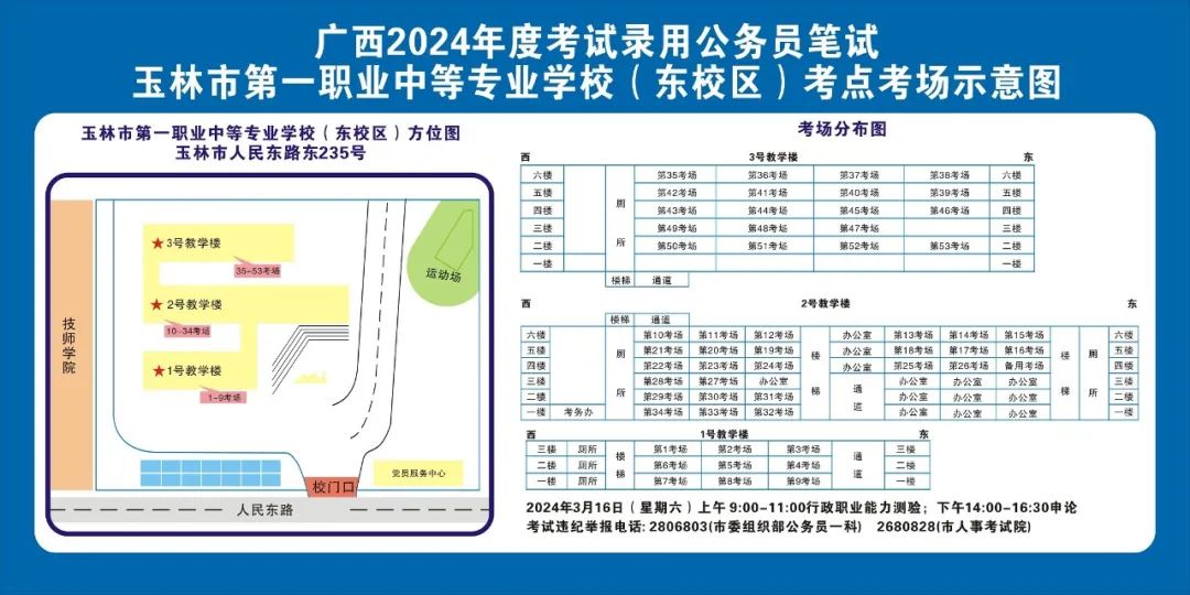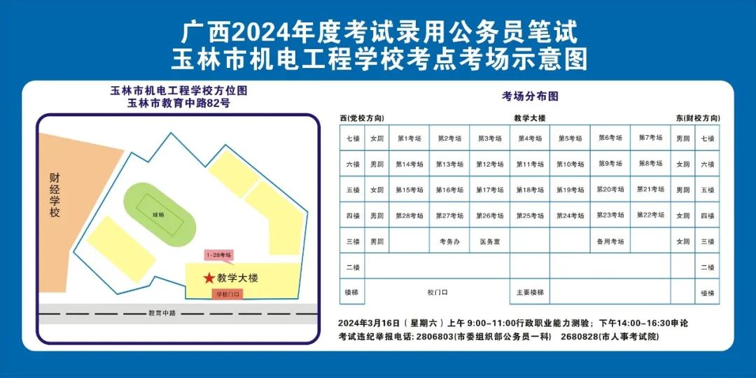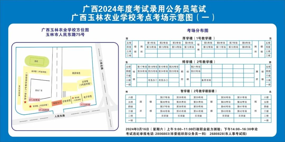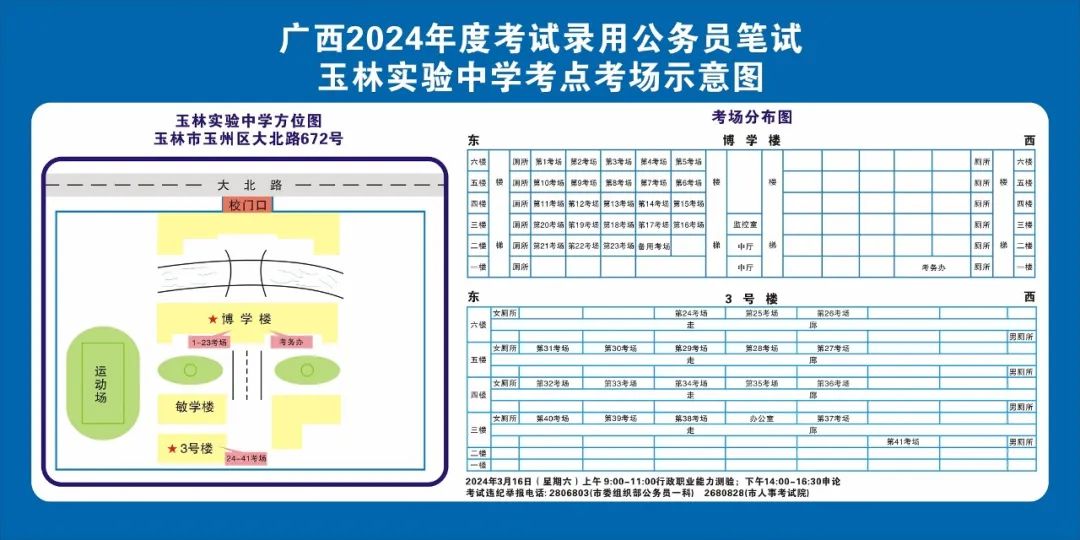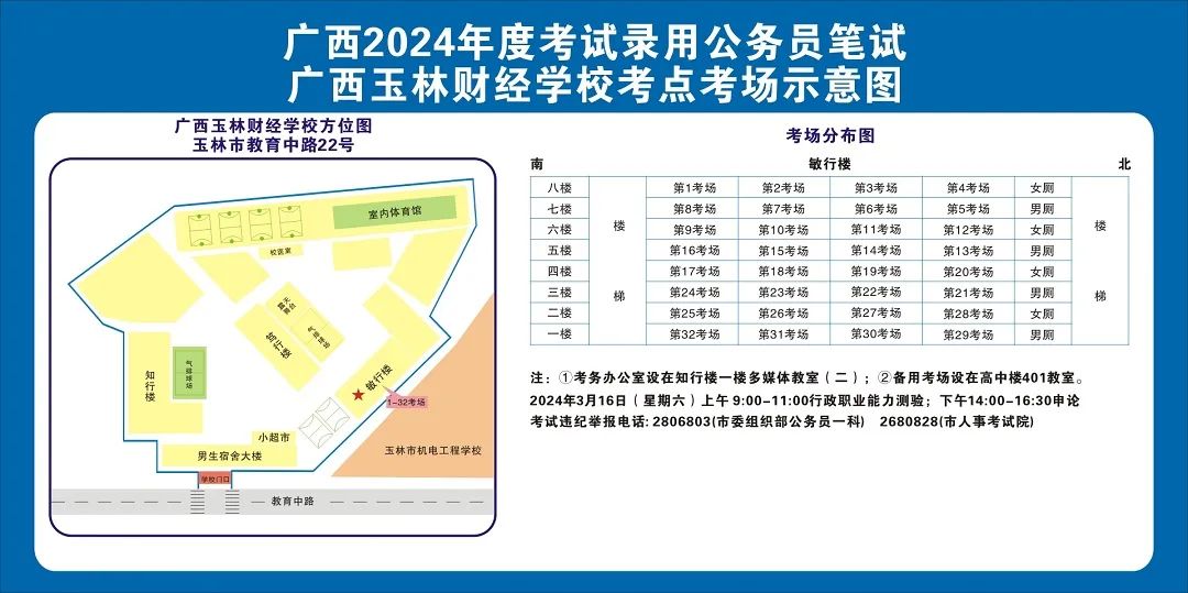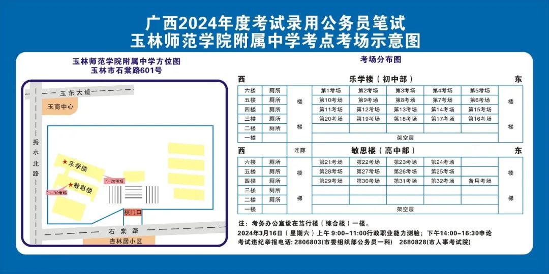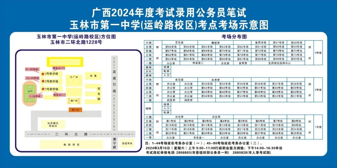 除考试当天考生可以进入考点外,考生不得提前进入考点查看考场(学校将在大门处摆放考场分布示意图),玉林考区10个考点的考场布置情况如下: