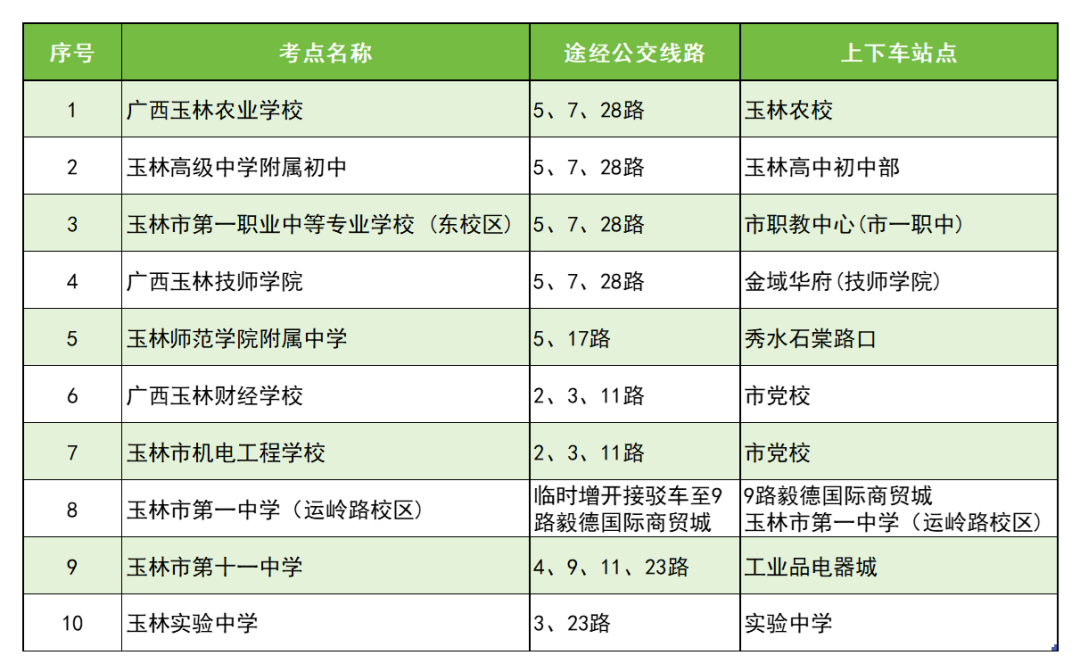 玉林市第一中学(运岭路校区)考点11:00-11:30,16:30-17:00 在考点安排公交车和值勤人员,负责将考生接送到9路毅德国际商贸城站点。